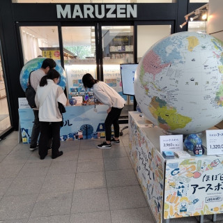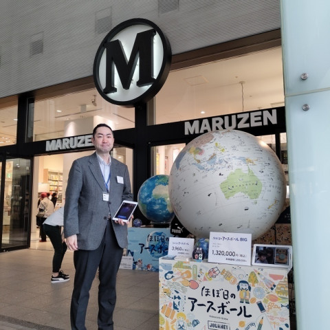 デカいアースボール!! 東京駅前は今日も春の気候です。 あたたかいです。 散歩の気分ですね。 丸善丸の内本店の前にお出かけすると、、おや!? なんだ! あれは! 右がわに見えるのは! ほぼにちのあーすぼーるが、 とつぜんあらわれた! 青いメインモデルBIGのほうは直径90センチメートル、白いジャーニーBIGのほうは直径1メートルあります。 実はそれぞれ販売もしていて、71万5000円と、132万円です! (税込価格です) 昨日は、幼稚園の関係者の方がBIGにも興味をもって下さっていたとか。 渡辺教具製作所の中村さん 「サービスで台座も お付けしているんです! 注文をいただいていて、 来月にもお届けする 予定があります。」 なんと。 この大きな地球儀が届けられることを想像するとワクワクしますね。 きょうもたくさんのお客さんに楽しんでいただけるよう頑張ります! 2024/03/31 11:09 |