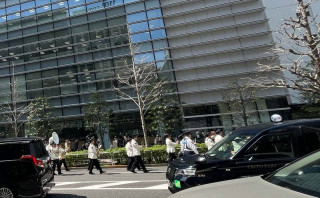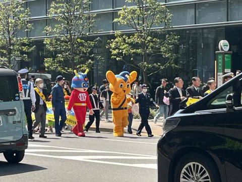 今日、お昼を買いに外に出ると、会社の前の道路にきぐるみたちと警察官が行進していました。