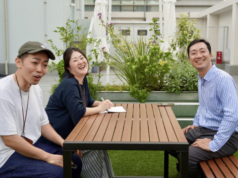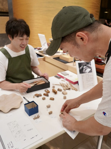 いい笑顔、いい打ち合わせ 先月、能登・輪島でお会いしたハイディワイナリーの高作正樹さんとほぼ日オフィスの屋上公園で再会。 そこで いい笑顔〜! 秋にむけて、いい打ち合わせができたと思いますので、また改めてご報告させてください♪ 高作さんが東京にいらっしゃっていたのは、輪島のワインと柚餅子(ゆべし)を輪島塗でいただく、というコンセプトのイベントが、昨日今日、COREDO室町の箔座日本橋で開催されていたから。 私たちも参加し、今月から販売スタートできたという中浦屋の柚餅子といっしょにハイディワイナリーの白ワインを試飲したり、 (力の微調整がむずかしそうでした) 数種類の使い込まれた小さなノミを駆使して生み出されていた 「木彫りのブサイク動物たち」はまるっとしたラインがとっても愛らしかったです。 ワインは、このあともしばらく、箔座日本橋で購入できるそう。 能登のおいしい食が揃うマルシェは、毎月開催されているとのことでしたので、わたしもまたのぞいてみます。 2024/07/07 21:20 |