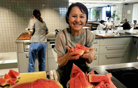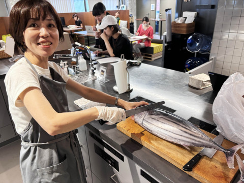 かつおをさばく! 気仙沼から、もうぶりっぶりの新鮮なかつおをいただいたので、みんなで本社3Fのキッチンでわいわい言いながらさばきました。 素人目にもよさがわかる、 (身がパーーンとはじけそう!) 立派なかつお。 ぜったいおいしい、もうこれは今日食べないともったいない。 サクにしたものを、それぞれに持ち帰らせてもらうかたちにしました。 「わたし、アジもさばいたことがないんです‥‥」という安木が、ほぼ日キッチン番長の 料理に慣れている 「こんな立派な魚をおろすのは初‥‥!」とだいぶテンションが高め。 「けっこう力が要る‥‥」 「うわ、内臓がでっかい‥‥」などと感動しつつ、さわりすぎないようにがんばってさばいていました。 さらに今日は、すいかのいただきものも。 こちらはささっとカットして、おやつテーブルへ。 旬のめぐみは嬉しいですね。 ありがとうございますー!! 2024/08/08 15:34 |