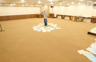 まだ続きます! 昨日突如始まった、「ほぼ日手帳の言葉を並べるLIVE」。 あれ? 今、 担当者不在でも、配信し続けるというスタイルでお届けしています。 本日は午後再開する予定のようです。 ほぼ日手帳の「日々の言葉」を並べるのは、20年以上、 その全容を知る人は、社内でも誰ひとりいませんでした。 2枚目の写真は、配信では映っていなかった運び込むときの様子です。 黙々と作業するところを見守りながら、 「紙を円形に並べて、 なにを考えているんだろう?」 「夕食は、差し入れのシウマイ弁当!」 「配信は無音だけど、 音楽を聴いているのかな?」 など、気になることだらけでした。 このあと何時に始まるか、終わるかわかりませんが、本日もよろしくお願いします! 2024/10/11 10:05 |
