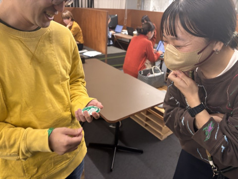 チップスターおじさん。 仕事のあいまのひと休み。 3Fにあるおやつテーブルのところで、そこにいた 「師走ですね、忙しいですなあ」 みたいな話をしていたら。 ‥‥話をしながら 「ごはん食べそこねたんですよ」とさっきまでバリバリ食べてたチップスターのフタを、ものすごく自然に頬っぺたに貼り付けはじめ (写真1枚目)。 さらには気づけば、フタを分解して腕輪にしていて (写真2枚目)、 なんなんだろう、このチップスターおじさん。 すごいなあ、尊敬します。 子どもたちに人気が出そう。 師走の忙しい気分がぶっとびました。 2024/12/11 17:49 |
