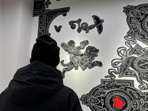 ニコラ・ビュフさんの個展 いま、いっしょに本を作っているアーティストのニコラ・ビュフさんの個展が、今日から銀座のメグミオギタギャラリーで、はじまりました。 私は初日の今日、コズフィッシュの祖父江さん、坂口さんと行ってきましたよ! 会場ではニコラさんご本人が、立体物の設置をしあげているところでした。 会場にある立体物は、これから彩色をほどこして、販売もするそうです。 作品のほとんどは、ギャラリーの壁に絵の具とチョークで直接描かれています。 このメグミオギタギャラリーは、ニコラさんの個展を最後に移転するそうで、 (なんと2010年のニコラさんの展示で、このスペースははじまったのだそうです!) ビルの改築とともに絵もなくなってしまうのだそうです。 祖父江さんは4枚目の写真の女神さんを 「チョー、キュートです」 とお気に入りのようでした。 こまかい部分もすべてがよくて、ギャラリーで時間を忘れるように見ていられます。 みなさんにもぜひ見てほしい! メッチャかわいい。 祖父江さんは 「ニコラさんから生まれたかった」 と、爆弾発言をされ、ニコラさんは 「順番が‥‥」 とおっしゃっていました。 会場に、私たちほぼ日が古くからおつきあいのある八谷和彦さんのお姿を発見し、うれしくて写真を撮りました。 ニコラ・ビュフ 「キューピッドの帰還」 メグミオギタギャラリー 2025年2月21日〜3月15日12:00〜18:00 2025/02/21 19:05 |