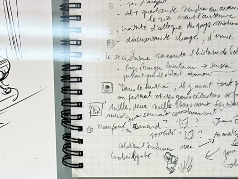 本を作っています デザイン事務所のコズフィッシュに来ています。 画家のニコラ・ビュフさんもいっしょです。 私たちは本を作っています。 1枚目の写真では新聞を机に広げていますが、作っているのは本です。 新聞の文字組がどういう変遷をたどってきたのか確かめながら、基本のレイアウトを作っているのです。 コズフィッシュの坂口さんは、このお正月をこの本の文字組の直しに捧げてくださり (ありがとうございます)、祖父江さんの10回の直しを経たそうです。 2枚目の写真はそのやり直しの束。 本がカッコよくなる過程はとても険しい。 絵を担当するニコラさんのフランス語のメモが、些細で驚くほどです。 何年もかけているので、お互いに齢を重ねています。 「尺取り虫のように進んでいるね」 と、祖父江さんはおっしゃいます。 まちがいなく進んでいます。 次の打ち合わせはゴールデンウィーク明け。 がんばります! 2025/03/26 17:46 |