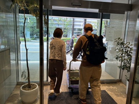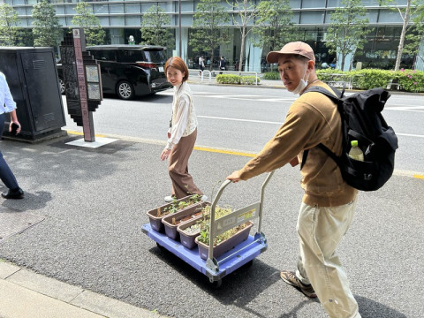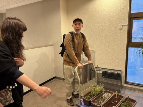 雑草プランター、どこへいく? わたしたち雑草部の大事な雑草プランターを どこへ運ぶんですか? しかも見守りの人がついています。 雑草プランターたちが、ほぼ日のビルを出て、安全運転で、そして見守られながらどこかへと運ばれて行きます。 不思議な光景です。 着いた先は、『ほぼ日の學校』スタジオ。 どうやら本日、土の研究者・藤井一至さんの授業が行われるとのこと。 その撮影スタジオに雑草プランターを飾るそうです! 雑草と土も深い関係があるので、雑草のためにも、これは参加して学んできたい! 2025/04/18 13:53 |