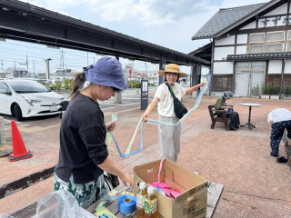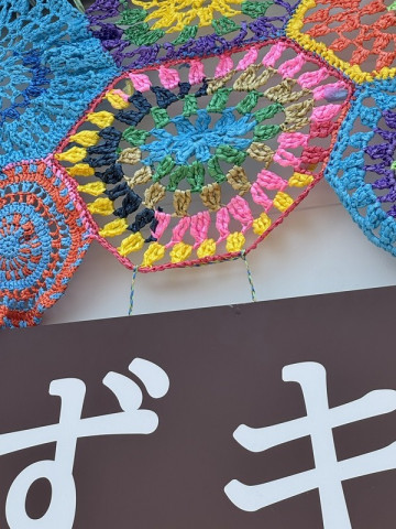 珠洲だよりその6 橋本さんだけではありません、助っ人は、すずちゃん、ひびさんという2名の若者たち。 この2人も、数ヶ月前に移住してきたそうです。 実はいま、けっこう若者の移住が増えているとか。 すずちゃん、ひびさんも、来るやいなや、みんながやっていることを見ながら、装飾をもっと華やかにする作業をどんどんしてくれました。 とりつけ作業は、誰もプロがいないので、その場で、どうやったらいいか? 考えながら、工夫します。 きゅうきょ、三つ編みをして、上と下をつなぐようにすることにしました。 うまくいくかな。 ひびのさんも時々、 「ここと、ここは、結束バンドでつないじゃって」 など、ちょっとしたアドバイスを言ってくださるのですが、それがまた、やるとすごく良くなる! その的確さったるや。 そうこうしているうちに、どんどん洗練されて、できてしまいました!(写真5枚目) ジャジャジャーーーーーーーン! 範囲が広がって、遠くから見ても、目立つようになったので、もっともっと、みんなに見てほしいです。次はもっと広げよう。 ひびのさんは、日曜日まで滞在して、ちょっと編んでは、隙間を埋めてくださるそうです。 たのしみだー。 暑い中、おつかれさまでしたー。 みなさん、すずキッチン、すずなり食堂に、ぜひ見に行ってくださいねー。 おつかれさまでした〜。 2025/06/20 00:13 |