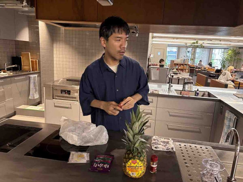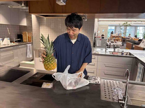 男がひとり‥‥ 今日の本社3Fのキッチンには、買ったばかりのスーパーの袋を下げた、男がひとり。 男の名前は 彼は中堅。 今夜は「鉄板と中堅」の本番だという。 あつあつの鉄板を前にみんなで話をするコンテンツ。 つまり毎回、なにかを焼いてみんなで食べるコンテンツだが、男の手にはパイナップル。 「今日は、これを、焼きます」 はぁーー、焼きパイン。 今晩はだいぶ変わったメニューみたいです。 しかも「ゆかり」も買ってきてました。 パインにゆかり‥‥焼いてかけて食べる? どんな料理か、全然想像がつきません (おいしいのかな?)。 中堅によるゆかりパイン配信は20時から。 気になるみなさん、どうぞお見逃しなく。 2025/06/26 17:16 |