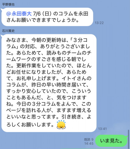 『N田の大失態を救え!』 異変に気づいたのは、読みものチームの稲崎だった。 毎日、毎日、ほぼ日の 「読みもの・観るもの」ページの冒頭を飾っている、日替わりの 「ほぼ日3分間コラム」。 読みものチームのメンバーが毎日執筆を担当しているのだが、2025年7月4日、更新直前だが原稿が登録されてない。 じつに、更新17分前。 担当は、老兵、N田。 どうやらやっちまったらしい。 さあ、どうする? その瞬間から、読みものチームのメンバーが連絡用につかっているメッセージルームでは、 「この危機をどう脱するのか?」 という緊急対策がはじまった。 添付した画像は、その生々しいやりとりのスクショである。 すばらしい後輩たちの対応に、N田は深く感謝した。午後3時ごろに。 2025/07/04 18:32 |