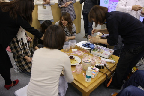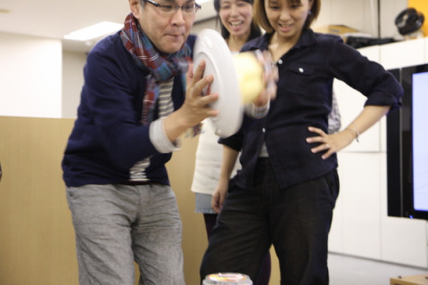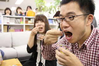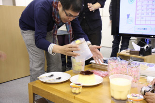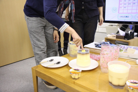 では、ぷっちんと。 「大役ではございますが、 ご指名をいただいたので、 行かせていただきます!」 さすが、です。 ではよろしくおねがいします。 お皿をかぶせて。 いよっ! うまくひっくり返りました。 それでは、一番のお楽しみ。 行きますよ。 「プッチン」 わぁぁぁぁ!!!(拍手) うまくいきましたっ。 いざ食べましょー。食べましょ−。 一緒に持ってきていただいたホンモノのプッチンプリンのケースにとりわけて、いっただきまーす。 「おいっしぃぃ」 「牛乳の味がする〜」 「これパーティーのときにほしいぃ」 「どれぐらいつくるのにかかるんですか」 「どこで買えるんですか〜」 「冷蔵庫で8時間です」 「がやがやがやがや」 「ロフトで12月4日から発売します」 「わいわいわいわい」 ということで、ぷちパーティーとなった残業時間でした。 この大きなプッチンケース、詰め替え用セットもあって、何回も使えるみたいです。 ロフトさん、グリコさん、ごちそうさまでしたー! 2009/11/05 12:10 |