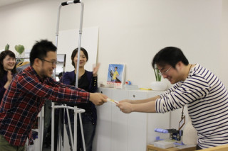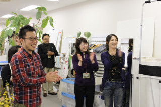 おめでとうー! 宇宙部の かわもっちゃんが、先週、結婚しました! みんなで集合して、お祝いです。 「おめでとー!」と拍手。 「指輪、見せて、見せて」の声に応えて、かわもっちゃんはガッツポーズしたあと、指輪を見せてくれました。 始終ニコニコしていて、おもいっきりうれしそうです。 出身地・広島の安芸の宮島で挙式だったそうで、当日は寒くて雨模様のところ、外に出るたびに雨がやみ、最後には空に虹がかかっていたとのこと。 直後のMTGでは、 「虹をかける男 カワモト」と呼ばれておりました。 おめでとうーー!! 2009/11/10 16:33 |