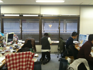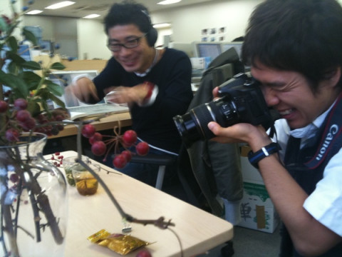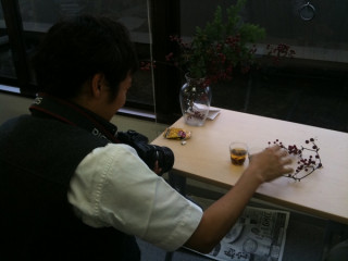 雨の窓際で。 雨ですね。 お昼ご飯から戻ってきて、席へつこうとしたらば、わたしの席の後ろに、不審者が!? 不審者は こらーーっ! 何しとんねん! あ、なるほど。 明日販売開始の簡さんのお茶のページに使う写真を撮っているのですね。 雨だけど、おつかれさまです。 近所の席のひとたちから、ひやかされたり、大変ですね。 ごくろうさまです! あれ? そういえば、この光景、なんだかデジャヴュ‥‥? そうそう、そうでした。 前にも、こういうことありましたよね。 この頃はまだちがったけど、今では 時は移りゆくんダスなぁ〜。 2009/11/11 17:00 |
