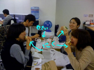 どうやら女子3名はお肉サンドを食べ、男子1名はベジタブル弁当を食べているようです。