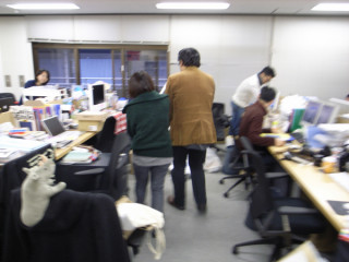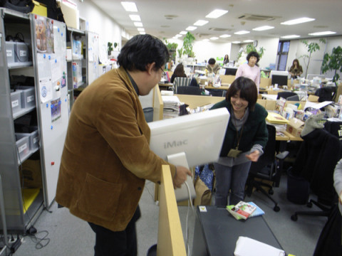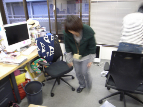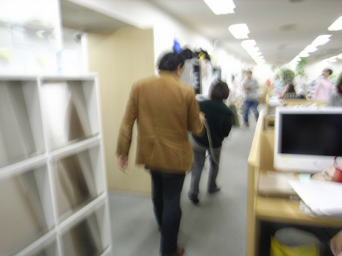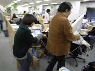席替え中の一コマ 大きなモニターを持ち上げて移動させようとした が 「わわわわわ、あかんあかん」と素っ頓狂な悲鳴をあげた。 ケーブルがコンピューターとつながったままで、ひっぱられたコンピューターが倒れそうになっている! 「あぶない!」と駆け寄って助けたのは すかさずケーブルを抜いたはいいが、抜いたケーブルをどうしていいやら‥‥。 戸惑う池本にスガノが言った。 「そ、そのまま、それを持って、 ついてきてください」 ・・・正しいのか、それ? 池本をおとものように引き連れて自分の席へモニターを運ぶスガノ (写真1枚目)。 しかし、曲がり角でよろけてしまい、またしても「わ、わわわ、あかん」と素っ頓狂な声で叫ぶ。 「・・・ぼくがそっちを持ちます」 池本の機転で主従が逆転し、ふたりは大きなモニターを無事に運びおえたとさ。 めでたし、めでたし。 2009/12/11 18:32 |