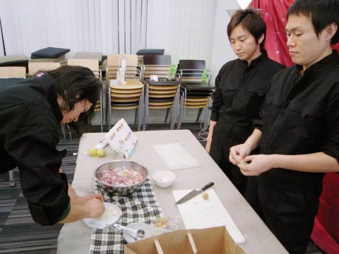 紅白LIFE合戦。 年末といえば、紅白歌合戦もありますね。 本日の「ほぼ日」大ホールは男性陣女性陣、お料理合戦で盛りあがっております。 手前赤の女性陣 セイ イェーイ! 「イェーイ!!!」 明るいです。 片や奥の白組男性陣 黙々と作業が進められているようですが、いつもの山口工務店と違って、慎重! ひとりが作業をしているのを、ふたりがじっと見ています。 ザ・男の料理。 以上、紅白っぽく見た、 「おうちでクリスマス」でした。 生中継はこちらへどうぞ〜。 2009/12/15 17:55 |
