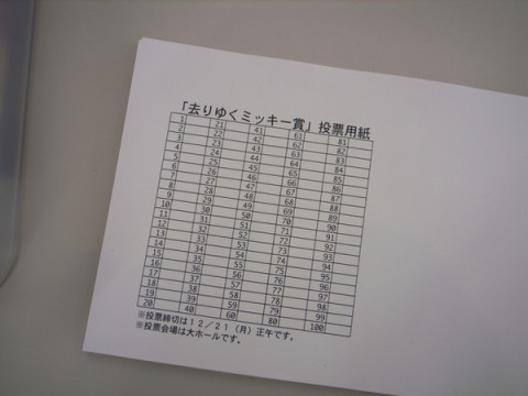 投票を! 昨年から、年末の恒例行事となった 「去りゆくミッキー賞」。 「ただいま製作中」に掲載された写真のなかから、投票によって、ベストピクチャーを選ぶ、というアレです。 今年は、100枚の作品がノミネート。 もちろん選んだのは さきほど、写真をすべて壁にはりまして、投票の準備は完了しました。 入り口の机にあるこの投票用紙を使って、 「おお、ええな。」と思う写真の番号に◯をつけていく、という仕組みです。 ◯はいくつでも構いません。 という仕組みでございます。 こちらの発表は、 「ほぼ日」では12/31に掲載する予定です。 2009/12/17 21:12 |