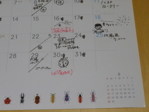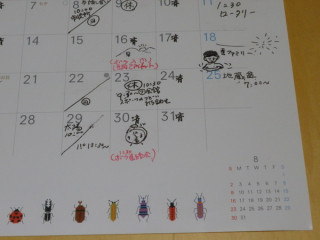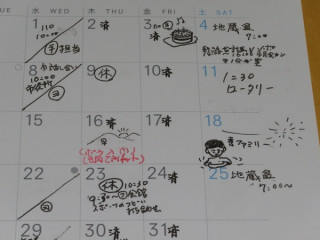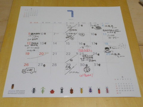 ホワイトボードカレンダー便り。 知人のお母さんが、 ホワイトボードカレンダーをとても気に入って使ってくれているそうで、こんな嬉しいメールをいただきました。 ーーーーーーーーーーーーーーーーーーーー 母なりに日々活動しているようで、帰郷するといつもカレンダーにあれこれ書いています。 絵が苦手と思っている母が、ちょこちょこイラストを書き込んでいるのもほほえましく、母のカレンダーへの愛着をかんじてしまいます。 以下、母の使い方メモです。 ○1日の内、予定が午前と午後に 分かれる時は斜線をひいて 左「am」、右「pm」にしている。 ○母は病院で働いていて (済と書かれているのは仕事の日)のほかに 要約筆記のボランティア活動をしていて、 黒字はじぶんの担当する日の予定、 赤字はじぶんは行けないけど ほかのメンバーが担当している日の予定、 と書き分けているそうです。 ○日の出の絵は、 月に1度早出出勤の日があり、 忘れないために。 絵で描いておくと遠くから見ても、 すぐ思い出せていいそうです。 ーーーーーーーーーーーーーーーーーーーー うれしいメールをありがとうござました。 2010年まであとわずか。 ホワイトボードカレンダーも残りわずかとなってきましたが、もし良かったら、来年のカレンダーとしてご愛用ください〜。 2009/12/22 20:00 |