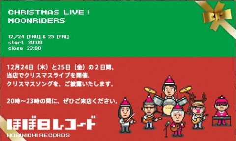 クリスマスライブ開催中! 今日と明日の2日間だけのクリスマスライブ、はじまりました〜。 曲目は、しっとりしたイントロ‥‥から途中でけっこう骨太なロックへと展開する、ムーンライダーズのクリスマスソング 「I am a Robot Santa Claus」です。 今日と明日の20時から23時までにご来店くださればなんどでもお聴きいただけますよ。 店内へはこちらからどうぞ。 2日間だけのスペシャルライブなので、ぜひ、あそびにきてみてくださいねー。 メリークリスマス! 2009/12/24 20:10 |