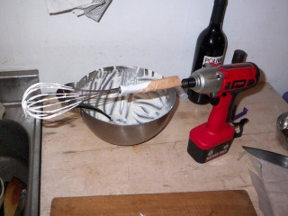 泡立て器?! メール、またまたいただきました。 シェフさまいつも楽しく読ませてもらってます。 僕もハンドミキサーがないので電動インパクトドリルに泡立て器をくっつけてケーキ作りましたよ。 (ちゃんと写真撮るの忘れてましたが) おいしくできました。多謝! (ウゴツマコ) 電動インパクトドリルにハンドミキサーをガムテで!!! 山口工務店もびっくり! 電動ドリル、持ってるので、次回はこれでやってみます。 チキンもおいしそうです。 メリークリスマス! 2009/12/25 18:01 |