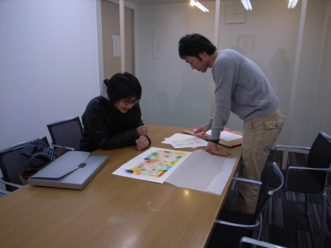 なかにある公園。』 金曜日の夜に、『あたまのなかにある公園。』のブックデザインをお願いしているプリグラフィックスの清水さんが荒井良二さんの絵を見に来ました。 「スキャンする?」 「いや、スキャンは怖いでしょう。」 「ここは、凸版の藤井さんに お願いすべき?」 「そうしよう。とりあえずアタリは 必要なので、写真をとります。」 「じゃ、ぐっさんにおねがいしよう」 ということで、写真を撮影したもので、ただいま鋭意デザイン中(のはず)。 ところで、ただいま、タイトルの英訳をゆるゆると募集中。 くわしくは、こちらを。 2010/01/12 14:00 |