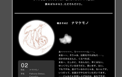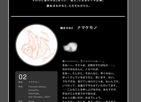 嘆き 本日、ローギアコンテンツ 『バフンウニの嘆き。』の2回目の更新の日でございます。 今回は、ナマケモノが嘆いておりますが、こちらのイラストは山下画伯のもの。 ただ、 「嘆き」にしたのです。 それを見ていた画伯は、 「釈然としないけど、 まあ、そんなものだろう。 ぶつぶつぶつぶつ。」 となげいておりました。 こちら、毎週火曜日に、永田画伯と山下画伯で順番に原稿と絵をかいています。 ゆるゆるとお楽しみください。 2010/01/12 16:00 |