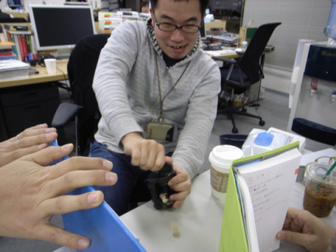防ぎながら。 「観たぞ、バンクーバーオリンピック」 についての相談をしていた。 そこに 殻付きである。 マカダミアナッツの殻は思っているよりも分厚くて固いことがわかったのが収穫であるとともに、殻割りマシーンの説明書を読まないと、殻が派手に飛び散ることも学習できた。 図は、学習する前に、殻を飛び散らせる寸前と、寸後である。 寸後じゃないな、直後だな。 それにしても、マカダミアナッツは美味しいですね。 それはさておき、会議の結論は、 「あんまり盛りすぎだから、 頭冷やして1週間後に集合!」 ということでした。 2010/01/13 10:50 |