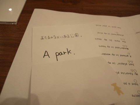 公園。』の訳、決定! 永田です。 たくさんの方にご参加いただきました、『あたまのなかにある公園。』の訳。 本日、その翻訳案リストを、弊社の英語をふつうに話す人たち3人にチェックしてもらい、最後にこの本の著者、糸井重里のところへ持っていって、どのことばにするのか、決めてもらうことにしました。 「いろいろな訳を見れば見るほど シンプルがいいような気がして」 そう言いながら、 「こういうのはどう?」と糸井が提案したのは‥‥ 『 a park 』 ‥‥「ア・パーク」です。 (大文字小文字の表記などは またあとで考えますね) 「応募作じゃないのに決めたら みんなに悪いかな‥‥」と著者は心配されていましたが、担当編集者として 「どうぞ、思ったままに!」 と伝えました。 ご参加くださったたくさんのみなさん、どうもありがとうございました。 応募作から直接選んだわけじゃなくてもうしわけありません! でも、みなさんのたくさんの訳がなければこのシンプルな表記にならなかったと思いますから、やはり、お礼を言わせてください。 どうもありがとうございます。 また、続報がありましたら、ここでお知らせしますね。 それでは! 2010/01/20 22:01 |