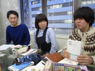 会議とおっくん。 昨日は、「読み物チーム」が臨時で会議をしていたのです。 いつもの会議とは別に、懸案があったので時間をとってじっくりと話をしたという次第です。 まだ、企画の段階ですが、 「できたら超うれしい!」という念願のものでございます。 さて、その話題も終了し、一息ついたところで、おっくんがおもむろに 「ちょっと相談したいことがあって。」 と、切り出したのです。 無口なおっくんがしゃべりはじめると、みんなが一斉にツッコミ始めるのはいつものことで、かならず話がぐずぐずになるのが弊会議の通例です。 いや、なにをつっこんでるかっていうとまあ、説明がしにくいですが、コンテンツの中身ではなくて、 「無口な男の突然の饒舌」とか 「政治家的答弁」とか 「オウム返し」とかまったく関係のないところなんですけどね。 ともかく、北海道に取材にいくんだ、というようなことでした。 そして、皆口々に 「いってらっしゃーい!」ということで会議の幕は引かれた次第です。 2010/01/21 10:22 |