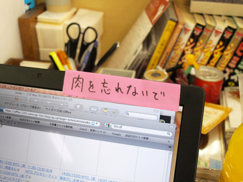 かの有名なメモ。 「チナメモ」という言葉をご存知でしょうか。 以前にもご紹介したことがあるのですが、 「 コウノはチナという名前なのです。 そのまんまで、すんません。 「チナのメモがおもしろい」 という評判は、社内でも有名でして、いろいろなところで発生しています。 さきほども、発生していたようです。 近所の 「出た! チナメモ!!」 見に行ってみたら‥‥。 「肉を忘れないで」 明日行われる企画に必要な肉のことなのですが、 「肉を忘れないで」 って、昭和歌謡のタイトルっぽい。 久々にいいのを出してくれました。 サンキュー 2010/01/26 16:51 |