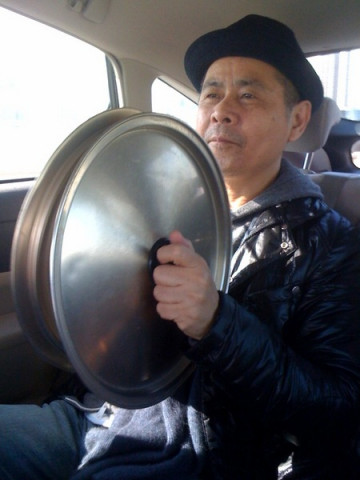 社長が、鍋ぶたシンバルを演奏中です。