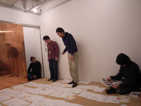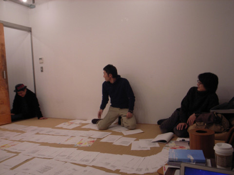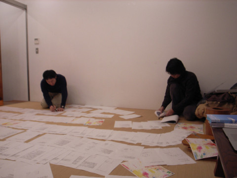 千客万来。 「あたまのなかにある公園。」の原稿を作っている和室に、夜になってから、デザイナーの清水さんがやってきました。 つらつらと話をしながら、合番をふったり、お腹がへったから、おにぎりたべたりしていたら、著者がやってきました。 「きみたちを見ないなあとおもって、 ブイヨンと探したんだよ。 あ〜、ここだよね〜。」 和室に広げられた原稿やら、 荒井良二さんに描いていただいた絵のカバーデザインをみつつ、編集者と著者が話をしていたら、そこに 「きまぐれカメら」の写真とキャプションのデータがばらばらになってしまっているので、写真のファイル名から、キャプションを逆引きできる仕組みをものの5分で作り上げて、その使い方を説明にきてくれたのでした。 そんなこんなで、お客さんがたくさんきたあとは、 こうなったら、ワタクシも退散です。 2010/02/03 13:32 |