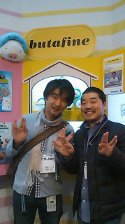 ぬいぐるみ&ストラップ! 『ギフトショー』へご招待してくださったのは 「ブタフィーヌさんのぬいぐるみ」を製作してくださっているバンプレストさんでした。 今回、いろんな方にブタフィー姫をお披露目するためにかわいい「ブタフィーヌさんコーナー」を作ってくださっていました。 ご担当の小林さん、ありがとうございますー! みんなでワイワイいいながら記念撮影〜。 たかしまさんは 「このぬいぐるみ、かわいい!」 と、ブタフィーヌさんを手にされたお客さんの声を、偶然、聞かれたそうでとてもうれしかったそうですよ。 「ぬいぐるみ」と「ストラップ」はひきつづき、いろんなお店で一般発売される予定だそうですのでくわしいことが決まり次第、おしらせいたしますね! それでは、ごきげんよう〜。 2010/02/05 22:13 |
