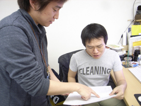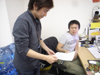 棟梁、吠える 3月の2日、とある脚本家の方が、社長と対談にきてくれるのだ。 ファンが多いため、社内で公開の対談である。 公開の対談の場合、多くはセットが組まれる。 もちろん、 山口工務店の手によるものである。 今回、設計は部下である西田マンの仕事と棟梁・山口は決めたようだ。 図面をもってきた西田マンに、普段の温厚さとはかけ離れた厳しいコメントをする(一部ウソ)。 「そんなに、ベニヤは必要なのか!」 「あ、そうか。 石膏ボードのほうがいいんじゃないか!」 「重量を考えてくださいよ。」 「やり直し!」 「なんでやねん!」 2010/02/26 11:01 |
