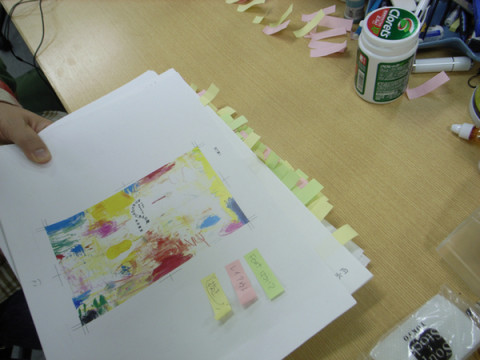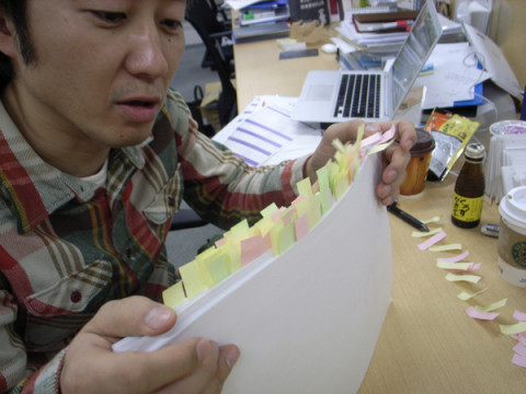 ジュリアナの付箋 さて「あたまのなかにある公園。」の 短縮形について議論しているまに、編集者・永田は着実に初稿に赤字をいれておりました。 「おわったよ〜。」の声がしたので、机にいってみると‥‥。 「ほら。そうでもないでしょ?」 どうも、紙の束の置き方がおかしいんですけど。 「ずらしていくとね。」 お、今回もやりましたね。 だいぶピラピラのゲラができましたね。 これなら、お立ち台に登れます。 さて、これを修正するのはだれかと申しますと。 (つづく) 2010/03/10 10:49 |