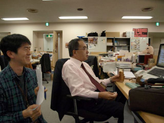 パソコンにむかって、左手に葉巻のようなものを持って。