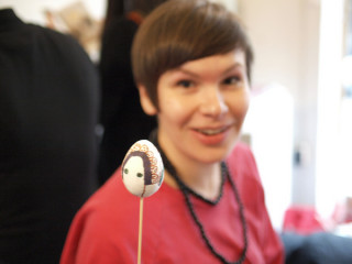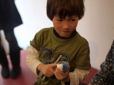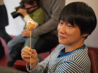 福田通信4/3 その2 いやはやこの球体に絵を描くのって、すごく難しいです。 やっぱり慣れているこちらのみなさん。 2枚目の女性はこのNAPAギャラリーの代表である、アーティストのイェンニ・ロペさん。 「さすが‥‥負けた‥‥」 と、福田さんは言いますが、細密な福田さんのたまごもとっても評判がよかったですよ。 しかしこういうときにかなわないのが、子ども! のびのびと楽しそうに描く、その楽しさがそのまま卵になっちゃう感じです。 わたくしは「構成主義っぽくさ」 なんて考えてたら、なぜかダルマができた。 うーん?! 2010/04/04 06:55 |