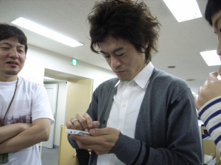 新製品と貴族たち。 鳥井さんが携帯電話を新しくしました。 何年ぶりかに新しくしました。 弊社には新しい電化製品に必ず群がる家電貴族たちがいます。 矢印の3人は筆頭です。 「ねえちょっと メールだしてみてよ。 あ、写真添付してさ」 というようなリクエストが次々と飛びます。 しかし、携帯電話にまったく興味がない鳥井は、操作がおぼついておりません。 そして、とても残念なことに、彼の携帯で最初に撮った写真は一番下の間抜けなやつでした。 人の携帯を穢した気分がいたしました。 2010/04/06 22:30 |