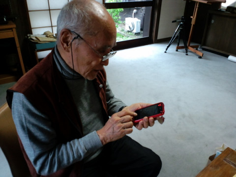 他人の携帯のアプリを次々立ち上げていく詩人。