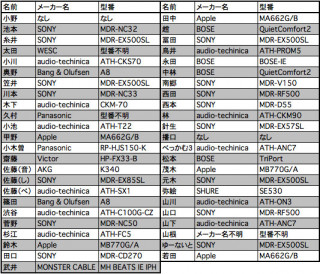 乗組員のヘッドホン事情 少しまえのことです。 そのメールの最後には、こんなことが書かれていました。 「ほぼ日」のヘッドフォン事情、知りたいです。 (tomo99) tomo99さん、ナイス着眼点! 弊社のヘッドホン所有率は高く、 「全員が持っている」と言っても過言ではないと思われます。 ガジェット好きの自分としても興味津々。 じゃあ、ちょっと調べてみますか。 「あなたが使っているヘッドホンは どこのメーカーのなんという商品?」 ひとり、ふたりと訊いていくうちに調査しているこっちがおもしろくなってしまい、最終的には全員分調べてしまいました。 その調査報告書が左の表組みです。 調子に乗って円グラフも作っちゃいました。 ソニー率高っ! この調査結果、内部でもなかなか好評でした。 約50人もいると、もう立派な「社会」と言えますね。 ちょっと燃えてきちゃいました。 さて、次は何を調査、報告しよっかなぁ。 2010/04/14 12:05 |