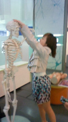 等身大の骨模型におかしなポーズをさせる麻理香さん。