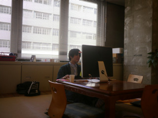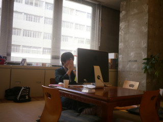 昨日今日と、 「和室にこもっております」 と社内にメールを出していた、 赤瀬川原平さんへのインタビューの新コンテンツの編集作業を集中的に、こもってやっているそうです。 とはいえ、ノートパソコンではなくて、デスクトップタイプを和室に持ち込むというのは‥‥すごいです。 気合いがちがうわ、おっくん。 しかしカメラを向けてると、どうしても顔がにやけてしまうおっくん。 何度撮り直しても、手で顔を覆っても、にやにや。 にやにやの止まらないおっくん@和室でした。 2010/05/18 14:51 |