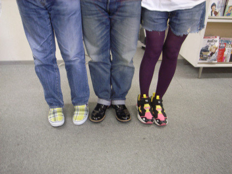 クレイジー・足元。 よしあきさん( みんなが休暇にいって、帰ってくると 「あ、帰ってきたな。」という瞬間があります。 よしあきさんの場合は、 「もぎちゃ〜〜ん! 写真写真〜!」 といって、この「製作中」にアップする写真のシャッターチャンスを教えてくれる時でございます。 「みてよ、このおかしな 足元群を。」 わ、ほんとだ。 チェックにエナメルに、なんだか派手な靴。 というか、 あなたその服も財布もすごいね! ちなみにですよ。 「ほぼ日感激団」の「細川展」のまとめ中だということです。 2010/05/18 17:58 |