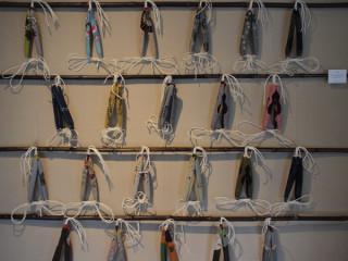 ギャラリーには2Fがあってそこはてぬぐいと下駄の鼻緒の展示です。