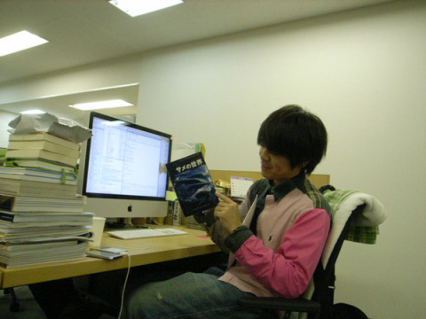 サメ博士。 おっくんがこのところモニターにサメの画像をだしては原稿を書き、ということを繰り広げている。 モニターをみるたびに違うサメがうつっている。 その机に積み上がった本の大部分がサメについてのものだ。 いま、新宿鮫担当として、 「サメについて」のコンテンツを製作中なのである。 ちょっと質問をしてみよう。 深海に住むサメっているの? 「あ、おもしろいやつだと、 ミツクリザメというやつで、 そのサメは云々。」 日本近海にも人食いザメはいるの? 「あ、いますよ。 ホホジロザメがいますから。」 じゃあ、最近事故があったり? 「一番最近だと、 四国のほうで云々。」 かなり、サメ博士になっていると思います。 たいがいのサメに関する質問にこたえてくれる気配です。 2010/06/15 14:49 |
