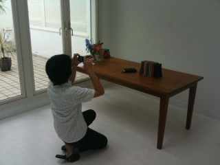 写真はiPhoneで構図を考えるプリグラフィックスの清水さん。