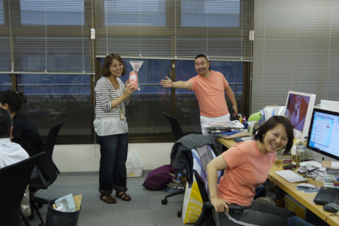 気持ちいいっ! ツイッターのほうでもさえずられていましたが、今日はハプニングで なんともラッキーなことに、今日はTシャツの社員の注文分が届いた日。 新しいTシャツにさっそく着替えています。 「せっかくだから」と、同じ色を着ることに。 そして、先ほど、一瞬出かけた 「これはもう、コーラルピンクに 着替えるっきゃないね」 と、たまたま自分も購入していたコーラルピンクを掲げていました。 先輩ふたりも、仲間が増えてうれしそう。 今日は、あと何人コーラルピンクが増えるのでしょうか? 次は‥‥あなたかもしれない! 3人とも、着た瞬間に、 「うっわー、気持ちいい〜〜!」と叫んでいたのが、おもしろかったです。 そうとう、気持ちいいらしい。 むしろ、わたしもびしょ濡れになって、着替えちゃおっ‥‥なんちゃって。 家でゆっくり着てみまーす。 2010/07/05 18:11 |