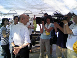 3人組 花がそんなに似合わない3人組のうちの一人、 目の前では、小石川植物園の園長さんがテレビの方達の取材を受けていました。 取材陣 「咲いたらどんな匂いがするんですか?」 園長 「実は私も嗅いだことないんですよねー。」 そ、そうか。 園長さんでも開花に立ち会うのははじめてのことなんですね。 ちなみに開花は十数年に一度とも言われています。 と、ここで閉館時間のチャイムが。 残念。 今日は時間切れ。 開花の様子はきっと明日の報告で! 2010/07/21 16:55 |