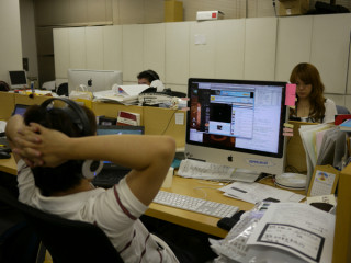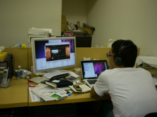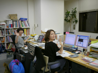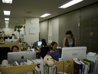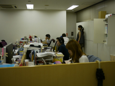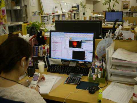 出張のひとが多いため、やや静かな社内では、みんな、花火を観ています。