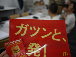 わっしょいっ! もうすぐ始まるのは、大ホールで行われている あ、じゃなかったミーティング。 ドキドキしながら、様子を見に行ってみました。 隙間からのぞくと、なんだかいける雰囲気。 思い切ってはっぴ姿で手拍子叩きながら入ってみました。 すると、歓迎ムード。 昨日の野球観戦のときに配布されたものですね。 なんだかマクドナルドづいている弊社ですね。 「ガツンと一発」 はい、いかせていただきます。 はっぴ着て。 あ、 ヒルズとの往復おつかれさまです。 じゃ、これにて、おじゃましましたモンティーヌ! わっしょいっ、わっしょいっ!! 2010/08/05 14:52 |