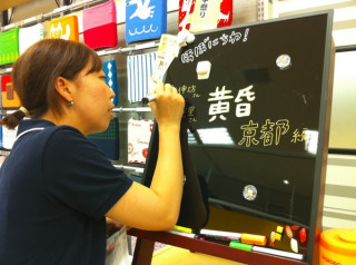 外山ちゃんが、手書きで黒板におしらせを書いてます。