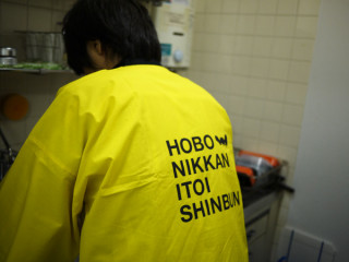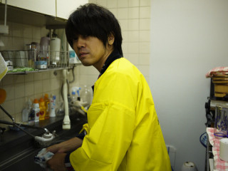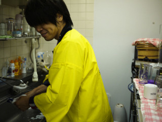 はっぴを着たまま食べ終わった愛妻弁当を洗っています。